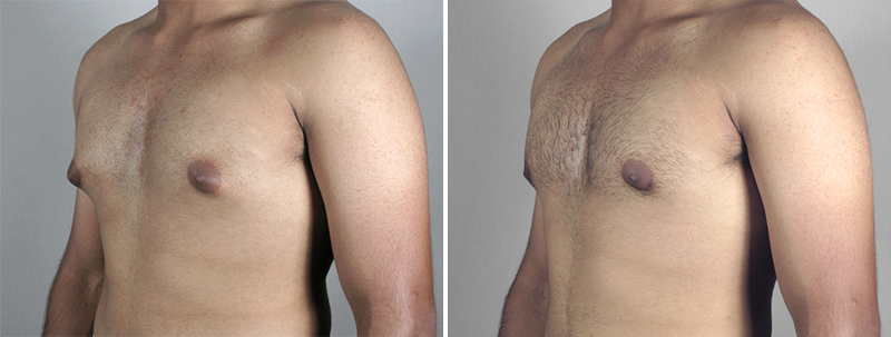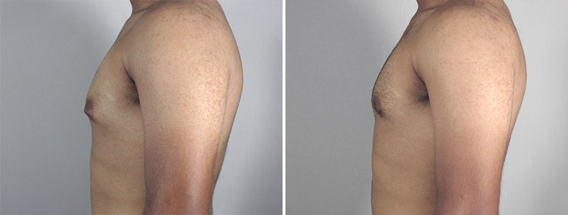 This 21 year old, referred to Dr. Parker by his pediatrician, requested improvement in the appearance of his chest. He said his breasts enlarged at age 13 and have remained that way since. Dr. Parker removed the fatty and fibroglandular tissue with SAFE liposuction and direct excision through a small hemi areolar incision, 90 cc on the right and 95 cc on the left side. The patient experienced little bruising and swelling. He is quite pleased with the now normal contour and appearance of his chest.