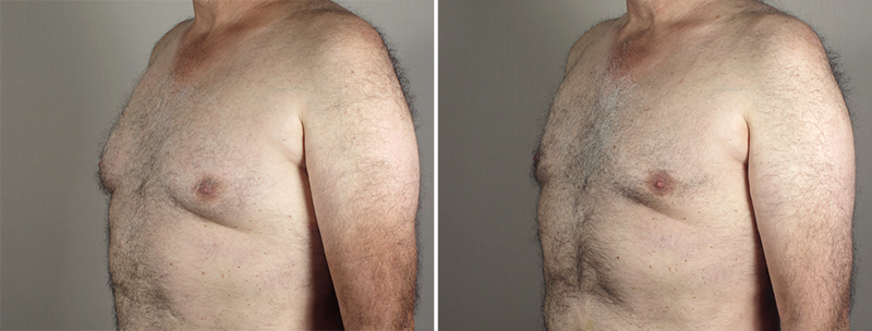 This 63 year old requested improvement in the appearance of his enlarged breasts. He said they have been like this for as long as he can remember. His motivation for surgery was watching his father, who has had the same condition, age. As he father aged, his breasts became very pendulous and this patient wished to avoid the same happening to him. Dr. Parker treated the patient with VASER liposuction to melt and removed the excess fatty tissue from his breasts. He also used it to help bring about skin contraction and avoid sagging skin. Dr. Parker removed 200 cc of fat from the right breast and 225 cc of fat from the left. The patient recovered quickly after surgery. His skin contracted nicely to conform to the shape created by fat removal from the breasts. The patient is very happy with the normal contour of his breasts after surgery.