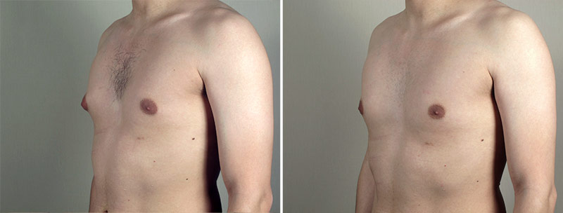 This 29 year old complained to Dr. Parker that his right nipple/areolar complex was fuller and more puffy than the other side. The patient said he first noticed this during puberty and the issue has persisted ever since. A work up by his pediatrician was negative for any underlying hormonal condition. Dr. Parker told the patient his condition is called gynecomastia and recommended treatment with SAFE liposuction through a tiny incision in the armpit. The procedure was subsequently performed with Dr. Parker removing 100 cc of fat from the right breast with liposuction. The patient recovered quickly afterwards. He is very happy with the markedly improved symmetry between his right and left chest.