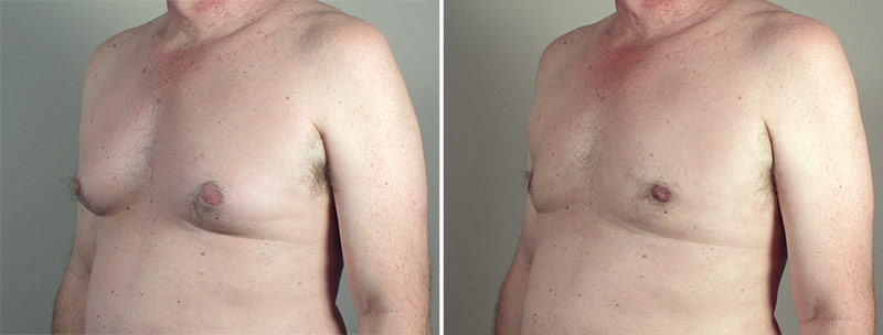 This 55 year old developed gynecomastia at puberty and it has persisted until the present time. He says other family members have the same problem. The patient is 5’9″ tall and weighs 175 pounds. Dr. Parker treated his gynecomastia with a minimally invasive approach removing fatty and glandular breast tissue through a 1/4″ incision hidden in the armpit using a modified liposuction technique. Post-operatively, the patient bruised a bit but had no pain. He is very pleased with the improvement he obtained from the procedure.