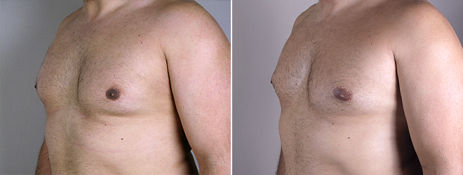 This 35 year old, had taken steroids for several years ago and developed breast enlargement, which did not subside. The patient is 6’0″ tall and weighs 210 pounds. Using the VASER liposuction system, Dr. Parker removed 200 cc of fat from the larger, left breast and 125 cc of fat from the right. The patient is happy with the improved size, shape and symmetry of his chest contour.