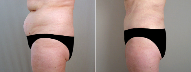This 55-year-old patient, referred by another patient, was concerned about the fullness of her hips and back. She is 5 feet 10 inches tall and weighs 195 pounds. Dr. Parker performed VASER liposuction of both hips and back: A total of 750 cc of fat was removed from each hip and 2200 cc of fat removed from the back. The patient recovered quickly from her surgery and is very pleased by the improved appearance of her torso and better fitting of her clothing.