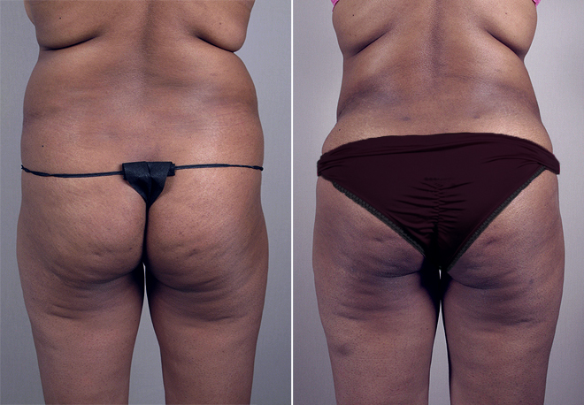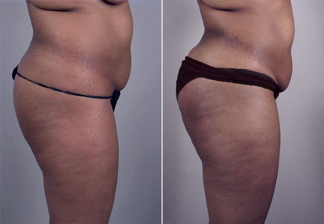 This 35 year old requested improvement in the appearance of the fullness of her hips and flatness of her buttocks. The patient is 5’3″ tall and weighs 130 pounds. Dr. Parker performed VASER liposuction of the patient’s hips, removing 650cc of fat from each side, purified the fat and then injected 300cc of fat into each buttock to provide more shape. The patient recovered quickly from her procedure. She is happy with the improved contour of both her hips and buttocks.