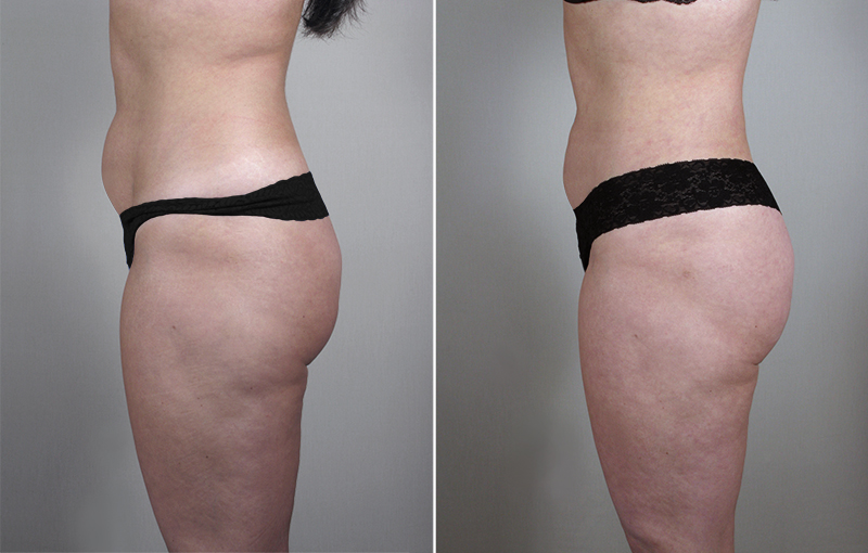 This 35 year old, referred to Dr. Parker by another patient, requested improvement in the appearance of her trunk and thighs. Eleven years ago, the patient had undergone liposuction by another plastic surgeon. She was unhappy with those results and referred to Dr. Parker for correction. Dr. Parker performed the VASER liposuction and removed fat from the following areas: abdomen–350cc, left hip–450cc, right hip–475cc, left outer thigh–150cc, right outer thigh–175cc, and left inner thigh–200cc, right inner thigh–150cc. Dr. Parker also released scar tissue in the inner and outer thighs and injected fat grafts into the areas of depression to make them more even with the surrounding tissues. Though the patient sustained quite a bit of bruising (she said she bruises easily), she said she had no pain. She was back to work in several days following surgery. She is very happy with her improved appearance.