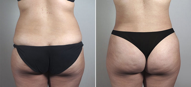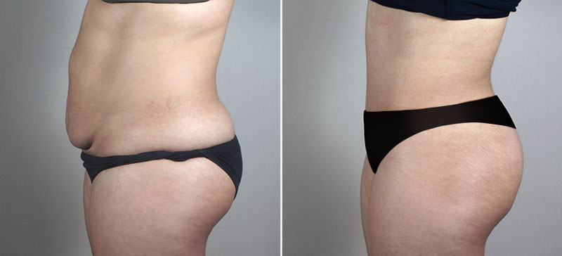 This 27 year old patient complained to Dr. Parker about the excess skin and fat on her abdomen after having two children. The patient is 5 feet tall and said her weight is stable at 135 pounds. Dr. Parker recommended a lipoabdominoplasty, or Parker Tummy Tuck, along with SAFE liposuction of the hips, to achieve her desired result. He subsequently performed these procedures at the same time, removing 750 cc (the same amount in a full bottle of wine) of fat from each hip and 675 cc of fat from the abdomen. The patient enjoyed a prompt recovery after surgery. She is ecstatic about her improved shape and contours. The patient reports her dress size has gone from 8 to 2 without any weight change.