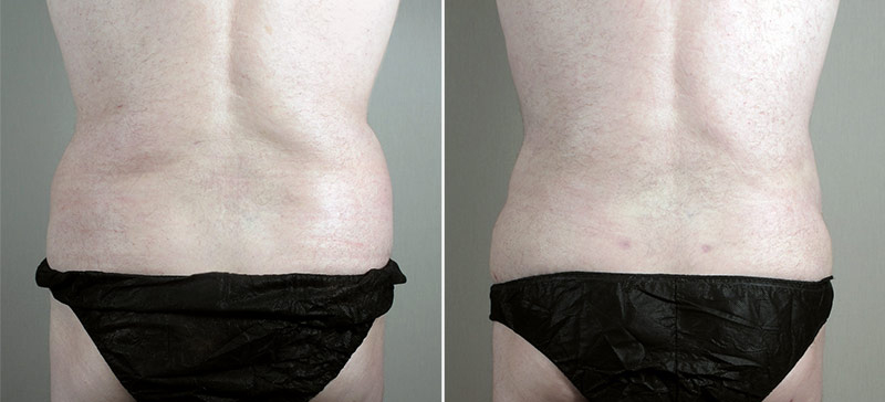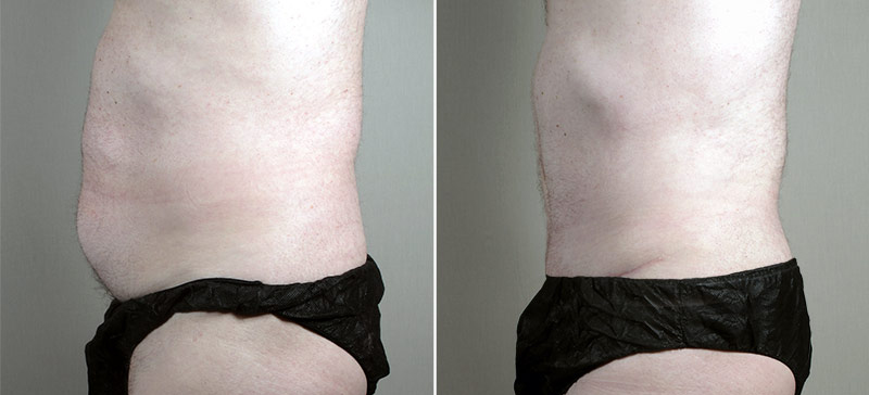 This 56 year old was referred to Dr. Parker by his wife, an existing patient of Dr. Parker’s. The patient lost 35 pounds through diet and exercise. He strained one day at the gym lifting a heavy weight and developed a protruding abdomen along with lower abdominal and back pain. Dr. Parker and his treating neurologist obtained a CT scan which showed no evidence of a hernia. Dr. Parker, the neurologist and patient discussed options and agreed that surgery to tighten his abdominal musculature was indicated. In surgery, Dr. Parker tightened the patient’s abdominal musculofascial laxity as part of a lipoabdominoplasty procedure. He also liposuctioned the patient’s flanks, removing 800 cc of fat from the right and larger side as well as 600 cc from the left side. The patient had to restrict activities for the first week after surgery but subsequently recovered well. He no longer has any abdominal or back pain, allowing him to return to vigorous workouts with his trainer. He also loves the improved appearance of his abdomen and flanks.