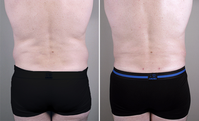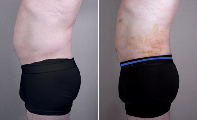This 51 year old asked Dr. Parker to contour his abdomen and flanks. Despite working out regularly, he was unable to lose fat in these areas. He said he did not want to model for underwear commercials, but merely to have a better contour. The patient is 5′10″ tall and weighs 178 pounds. Dr. Parker used the VASER liposuction system to remove 450 cc of fat from the abdomen and 425 cc of fat from each flank. The patient experienced no pain after surgery, and recovered quickly. He was very happy with his markedly improved contour.