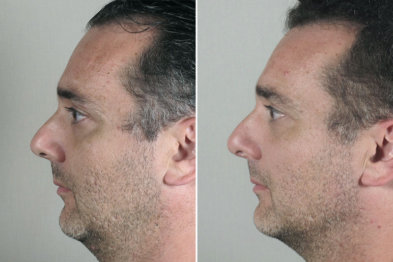 This 36 year old was referred to Dr. Parker by his family physician. He has been bothered by his asymmetric, bulbous nasal tip for some time and finally decided to do something about it. His only concern was his tip; he was happy with the upper portion of his nose. Dr. Parker discussed options with the patient and used computer imaging during the consultation to show him what the nose should look like after surgery. The patient liked what he saw and heard. Subsequently, Dr. Parker performed an open tip plasty whereby he removed excess cartilage from the nasal tip, then inserted sutures into the remaining cartilage to sculpt it into a more defined, yet a strong male nasal tip. The patient’s recovery was quick and easy. He loves the natural appearance of his nose and feels like it complements his face perfectly.