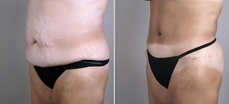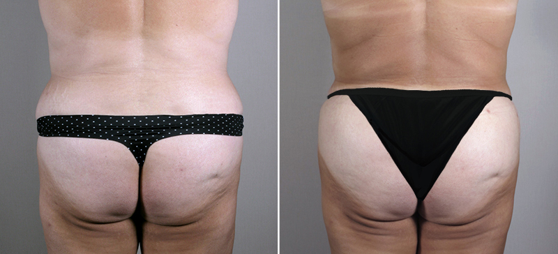 This 51 year old, referred to Dr. Parker by several former patients, requested rejuvenation of her tummy after childbirth, her “mushy” looking breasts and her flat buttocks. She is currently a B cup and wishes to be a C cup. The patient is 5’6” tall and weighs 158 pounds. During her consultation with Dr. Parker, the following operative plan was formulated: SAFE liposuction of the hips with fat injections to the buttocks, vertical augmentation mastopexy with the insertion of 350 cc silicone implants and lipoabdominoplasty. This procedure was performed by Dr. Parker under general anesthesia. He suctioned 300 cc of fat from each hip, 650 cc from the abdomen and injected the buttocks with 500 cc of fat on each side. The patient enjoyed a quick recovery from surgery. She is delighted with her post surgical changes: her more youthful, uplifted and fuller breasts, her flatter, more youthful abdomen, hips and buttocks. She now fills out a C cup bra nicely and has gone down in dress size from 8 to 4.