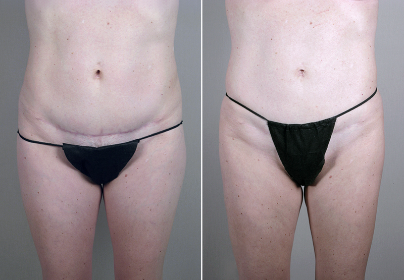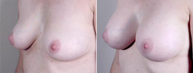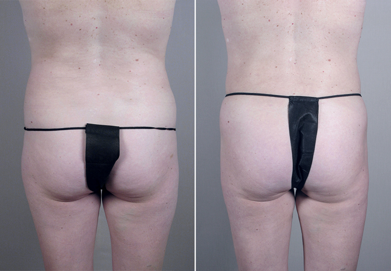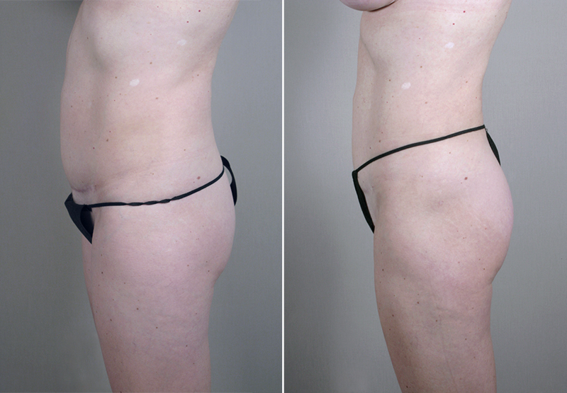This 38 year old asked Dr. Parker to give her breasts more volume as well as a lift. Additionally, she had a mini tummy tuck by another plastic surgeon two years earlier and she was still bothered by pockets of fat and an irregular appearance of her abdomen from that surgery. She requested that Dr. Parker improve this with liposuction as well as improve the shape of her hips and outer thighs at the same time. The patient currently wears a 34 B cup and would like to be a full C cup; she is 5’2” tall and weighs 125 pounds. The patient had chosen silicone implants in her Sizing Session, 350cc on the right side and 375cc on the left, to improve upon her pre-existing asymmetry. These implants were inserted by Dr. Parker through inframammary incisions into partial submuscular pockets. He also performed SAFE liposuction on the patient’s abdomen, hips and outer thighs removing the following amounts of fat: abdomen—225 cc, right hip—300 cc, left hip—325 cc, right outer thigh—200 cc, and left outer thigh—250 cc. The patient experienced very little pain, recovered quickly and returned to most of the activities of daily living within several days. Her incisions are not noticeable. She loves her natural looking, soft, fuller breasts as well as the improved contour of her abdomen, hips and outer thighs.
