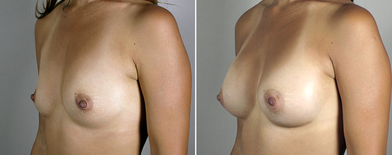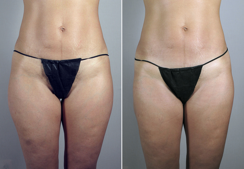 This 43 year old patient, referred to Dr. Parker by another patient, was bothered by her small breasts and the fullness of her outer thighs after having had two children. The patient is 5’8″ tall and weighs 132 pounds. She wears an A/B cup bra and would like to be one size larger. After consulting with Dr. Parker, the patient opted for silicone breast augmentation and SAFE liposuction of her outer thighs. The patient’s Sizing Sessions helped her decide to have a 300 cc silicone implant put in her right breast and a 250 cc silicone implant in the left and larger breast, in order to optimize symmetry. In performing liposuction of her outer thighs at the same procedure, Dr. Parker removed 500 cc of fat from her right side and 475 cc from her left side. The patient experienced very little pain and returned to activities within several days. She is very pleased with the improved appearance of her breasts and outer thighs.