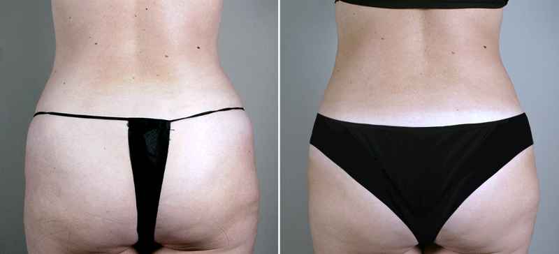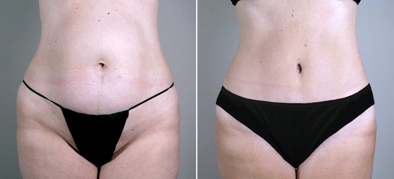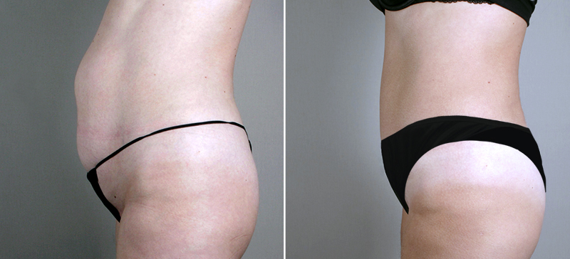 This 36 year old requested rejuvenation of her breasts, abdomen and hips after having had 2 children. She is 5’7″ tall and weighs 145 pounds. After examining the patient, Dr. Parker recommended silicone breast augmentation on her right breast and an augmentation/ mastopexy(breast lift) on her left side in order to achieve optimal symmetry. He also recommended a lipoabdominoplasty and SAFE liposuction of the patient’s hips. The patient decided she preferred a saline breast augmentation, and that she wanted only SAFE liposuction of her abdomen and hips. She was reluctant to undergo the tummy tuck because of healing time and wished to avoid a scar. During the patient’s first procedure, Dr. Parker inserted saline breast implants through periareolar incisions into a partial submuscular location, 300 cc on the right side and 325 cc on the left. He also performed SAFE liposuction, removing 450 cc of fat from her abdomen and 500 cc of fat from each of her hips. She recovered quickly after this surgery and was pleased with her results. She returned a year later asking Dr. Parker to perform a lipoabdominoplasty, having seen and talked with several of his patients who had the procedure performed. Dr. Parker performed a lipoabdominoplasty several weeks later. The patient was somewhat surprised how quick the recovery was from this surgery. She is now thrilled with the marked improvement in the appearance of her abdomen as well.