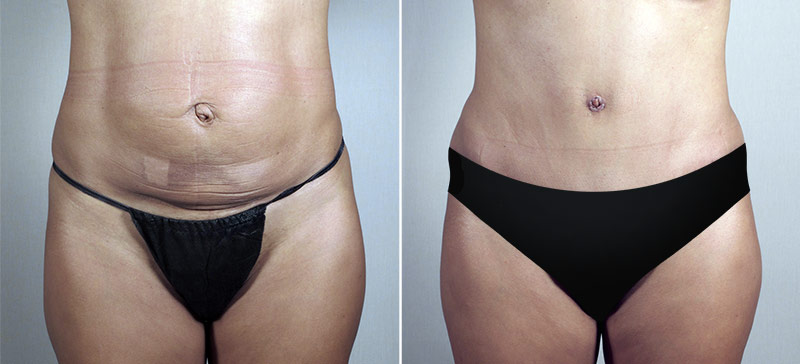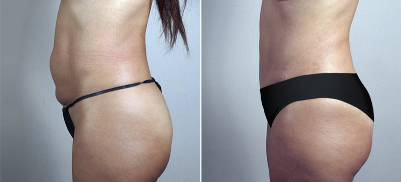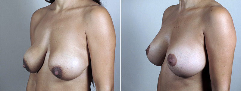This 44 year old was referred to Dr. Parker by another patient. She requested improvement in the appearance of her breasts and abdomen after having had twins one year earlier. The patient had undergone subglandular saline breast augmentation 12 years ago. She requested conversion to silicone implants in order to address the visible and palpable rippling of her existing implants as well as to lift her breasts into a more youthful position. The patient also asked Dr. Parker to perform a tummy tuck in order to remove excess skin and fat from her abdomen. The patient works out regularly and her weight is stable. She is 5′ 3″ tall, weighs 112 pounds and wears a 34 C bra. Dr. Parker removed the patient’s saline breast implants from the subglandular position and replaced them with somewhat larger silicone implants in a dual plane location. He removed a 225 cc saline implant from the right breast and 275 cc saline implant from the left. Dr. Parker replaced these with a 325 cc silicone implant on the right side and 375 cc implant on the left. He then performed a lollipop breast lift. In addition, Dr. Parker performed a lipoabdominoplasty and repaired the patient’s umbilical hernia. The patient recovered quickly after her surgery. She is very happy with the more youthful, natural look and feel of her breasts as well as her flatter abdomen and improved contours.