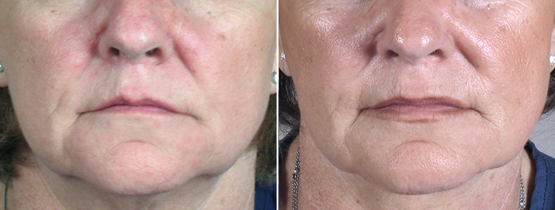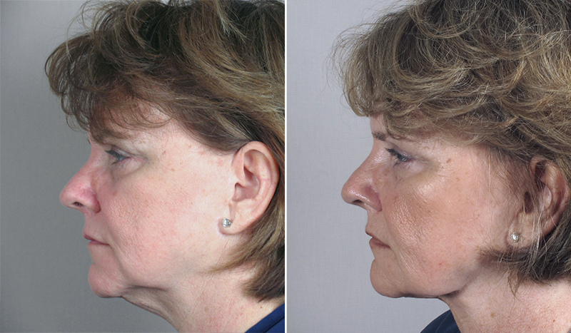 This 57 year old requested facial and neck rejuvenation. She had a facelift elsewhere 12 years ago and did not want another one now. Instead, she requested “fillers” to her nasolabial folds, marionette lines and areas on either side of her chin. Dr. Parker discussed options with the patient and they agreed on injecting her own fat into these areas in an effort to provide a longer effect. In addition, the patient requested ultrasonic liposuction of her neck both to remove fat and obtain some skin tightening. Dr. Parker used VASER liposuction on the patient’s neck to remove 35 cc of fat and obtain some skin tightening. He injected 4 cc of fat into each of her nasolabial folds, marionette lines and the areas on either side of her chin. She recovered quickly and well from these procedures and has been very pleased with her results. She is shown here 3 years after these procedures were performed.