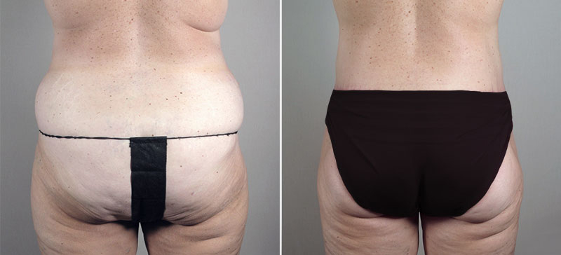 This 44 year old was referred to Dr. Parker by a family member, also a patient of his requesting rejuvenation of her torso following a 50 pound weight loss. The patient is 5’9″ tall and weighs 195 pounds. Initially, the patient requested a lipoabdominoplasty along with SAFE liposuction of her hips, inner and outer thighs as well as knees. Dr. Parker performed this procedure, removing the following amounts of fat: hips–400 cc/ side, outer thighs–450 cc/ side, inner thighs–200 cc/ side, knees–50 cc/ side. The patient enjoyed a quick recovery. She was very happy with her results but returned 2 years later requesting a lateral thigh and buttock lift to tighten and lift the skin in these areas. Dr. Parker subsequently performed this procedure. The patient again recovered very fast. She is thrilled with her the markedly improved contours.