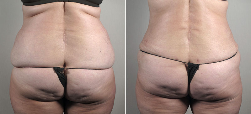 This 57 year old told Dr. Parker she was bothered by the appearance of her abdomen. Following a hysterectomy several years ago, she had developed and maintained a lower abdominal pouch. She said she is “tired of looking at ‘her pouch’” and wanted to “look and feel better about her tummy.”” The patient is 5′ 5″ tall and weighs 160 pounds. She works out moderately at the gym and her weight is stable. At surgery, Dr. Parker performed a lipoabdominoplasty and liposuction of her hips (removing 850 cc of fat from each side) and outer thighs (removing 550 cc of fat from each side). The patient said her recovery was much better than expected. Several months after surgery, she had gone down 2 dress sizes. She said she looks and feels great and is very happy she had the surgery.
