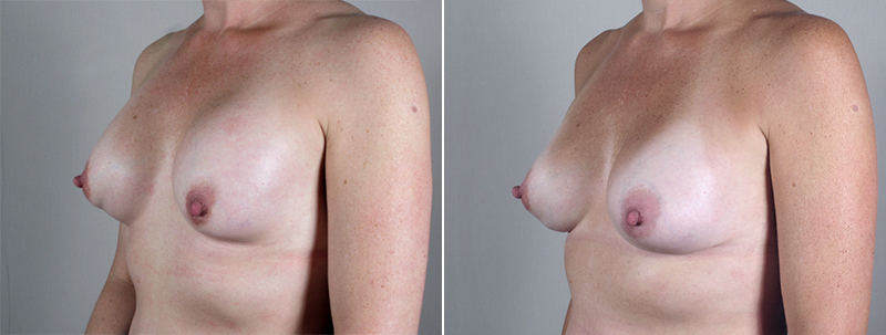 This 44-year-old was referred to Dr. Parker by another physician. The patient was unhappy with the appearance of her breasts 6 years after a saline breast augmentation performed by another plastic surgeon. She felt her implants sat too high on her chest and looked “fake”. After a discussion of various options between the patient and Dr. Parker, they arrived at the following operative plan. The saline implants were deflated preoperatively under local anesthesia, removing 330 cc of saline from each implant. A ‘Sizing Session’ was then conducted and the patient elected to have 300 cc silicone implants inserted. Dr. Parker used the patient’s existing inframammary incisions to remove the old saline implants and the surrounding capsular contracture. He released some of the scarring within the breast pocket and then inserted the new 300 cc silicone implants requested by the patient. Postoperatively, the patient healed quickly with no pain. She says her breasts look and feel more natural now.