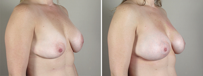 This 35 year old requested removal and replacement of her existing saline breast implants inserted 15 years ago. Recently, the right implant had deflated and the left implant had hardened. During her initial consultation with Dr. Parker, the patient indicated she would like to replace her saline implants with somewhat larger silicone implants, would like more cleavage, and to have less fullness in the outer aspect of her breasts. During her Sizing Session, the patient determined she wanted to increase her implant size from her existing 325 cc to 375 cc. At surgery several weeks later, Dr. Parker removed the deflated right implant and performed a capsulectomy on the left side to remove the implant and hardened capsular contracture around it. He expanded the implant pockets medially to give more cleavage, inserted sutures in the outer aspect of the pockets(lateral capsulorraphy) to centralize the implants and inserted 375 cc silicone implants. The patient recovered quickly afterwards with very little pain. She returned to full activities shortly afterwards. The patient is very happy with her markedly improved, softer breasts and loves her cleavage as well.