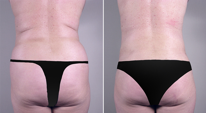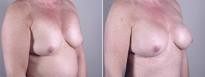 This 51 year old patient’s daughter had been operated on by Dr. Parker previously. She asked him to improve the fullness of her abdomen and correct the high-riding breast implants, inserted by another plastic surgeon several years ago. After reviewing all options with the patient, Dr. Parker performed the following surgeries. He removed the patient’s 240 cc saline implants from bilateral subpectoral pockets. He performed a more thorough pocket dissection and inserted 360 cc saline implants, which the patient had chosen in her preoperative Sizing Session. Additionally, he performed a lipoabdominoplasty and VASER liposuction of the hips, removing 700 cc of fat from each hip. The patient recovered rapidly with little pain. She is delighted with the improved shape of her breasts as well as her abdomen and hips.