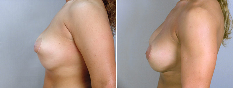 This 26 year old, referred to Dr. Parker by another patient, expressed concern about the appearance of her breasts. She had undergone prior breast augmentation and subsequent revision by another plastic surgeon several years ago. The breasts still do not seem right to her. In particular, she was bothered by the loss of the inframammary fold on the left breast and the large, protruding areolas on both sides. Dr. Parker reconstructed the left inframammary fold with internal sutures. He then performed bilateral periareolar mastopexies to reduce the size of the areolas and have a better proportion with the rest of the breasts. The patient healed quickly from this surgery and was very happy with the much improved appearance of her breasts.