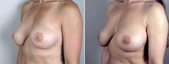 This 49 year old, referred to Dr. Parker by another patient, had undergone subglandular, saline breast augmentation by another plastic surgeon 11 years earlier. She complained that her right breast was larger than the left, and the implant moved laterally a great deal when she exercised. She found the left breast firm and uncomfortable. The patient is 5′9″ tall and weighs 136 pounds. Dr. Parker’s examination determined bilateral capsular contractures with a tear in the capsule on the right side. He recommended and performed bilateral capsulectomies with removal of the existing 300cc saline implants. He then inserted silicone implants into partial submuscular pockets, using a 325 cc implant of the right side and 350cc implant on the left to achieve better symmetry. The patient recovered very quickly from this procedure and is delighted with the size, shape and softness of her silicone implants. She no longer experiences any discomfort on the left side or unusual movement on the right side with exercise.