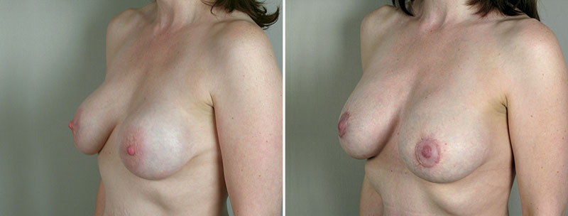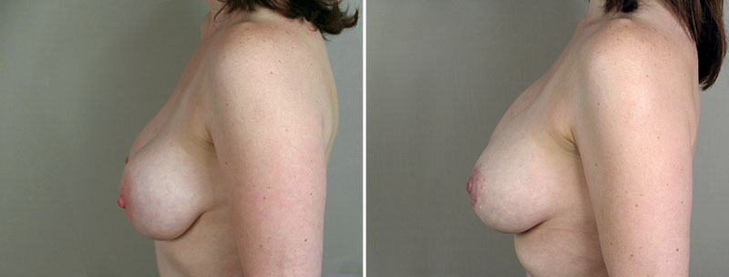 This 41 year old, referred by another physician to Dr. Parker, requested improvement in the appearance of her breasts. Nine years ago, the patient had undergone transumbilical breast augmentation with the insertion of saline implants in a subglandular position by another plastic surgeon. She was troubled by the visible and palpable rippling of her implants. She also requested improvement in the appearance of her large areolas. After reviewing all options with the patient, Dr. Parker performed bilateral capsulectomies with removal of both implants through peri-areolar incisions. He removed a 360 cc implant from the right side and a 390 cc implant from the left side. He then inserted 400 cc silicone implants bilaterally in a partial submuscular location. Finally, the areolas were reduced in size to more appropriately match the shape and size of the breasts. The patient enjoyed a prompt recovery associated with little pain after surgery. She is extremely happy with the improved size, shape and appearance of her breasts.