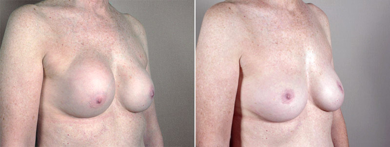 This 59 year old nurse, referred to Dr. Parker by another plastic surgeon, requested removal and replacement of her breast implants. The patient had undergone subglandular silicone breast augmentation by another plastic surgeon in 1983. She developed a progressive capsular contracture in the right breast in recent years, less so on the left side. An MRI indicated the silicone implants to be intact without leakage. The patient wished to stay the same size as her original augmentation. At surgery, Dr. Parker removed both breast capsules and silicone implants from their subglandular location through the patient’s existing inframammary incision. He weighed the implants and capsules removed, then replaced them with similar sized silicone implant–225 cc on the right side and 250 cc on the left. These were placed in a partial submuscular location. The patient recovered without any pain or bruising postoperatively. She is very happy with the natural look and feel of her breasts.
