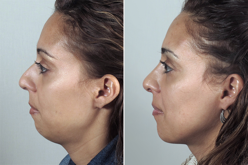 This 34 year old Hispanic patient requested that Dr. Parker improve the appearance of her nose. Specifically, she was bothered by her dorsal “hump” and “broad tip”. During the patient’s consultation, Dr. Parker discussed how he could perform an open rhinoplasty to improve the appearance of the patient’s nose. He also tactfully suggested that inserting a chin implant would help to build out her weak chin. Dr. Parker explained that a chin implant would complement the adjustments being made to the nose and help achieve better facial balance. The patient agreed with the plan. Dr. Parker subsequently performed an open rhinoplasty, reducing the bony-cartilaginous hump, as well as refining and setting back the patient’s bulbous nasal tip. Dr. Parker then inserted a #3 solid silicone extended anatomic chin implant through a small submental incision. The patient enjoyed a quick, painless recovery. She is thrilled with the appearance of her nose, chin and improved facial harmony.