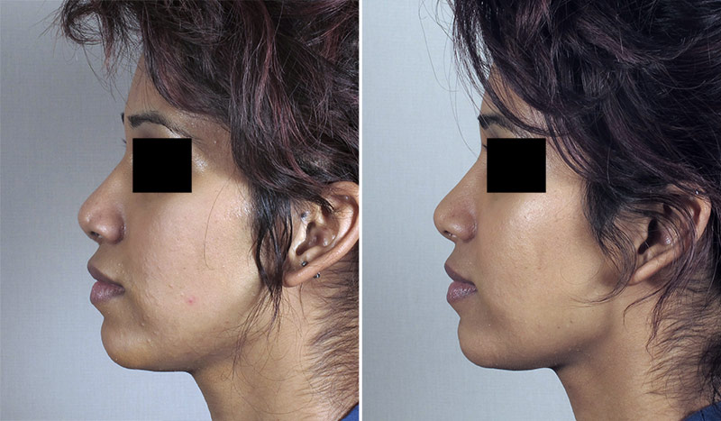 This 33 year old presented to Dr. Parker requesting improvement in the appearance of her nose. She was bothered by the excessive width of the upper and lower nose, dorsal hump and broad tip. Dr. Parker subsequently performed an open rhinoplasty where the following steps were taken: reducing the bony cartilaginous hump infracturing to narrow the upper nose re-shaping the tip cartilage including use of cartilage grafts to create a more defined tip alar base resectioning to narrow the width of the lower nose The patient was delighted with her pain free and quick recovery. She is very happy with the natural, more refined appearance of her nose.