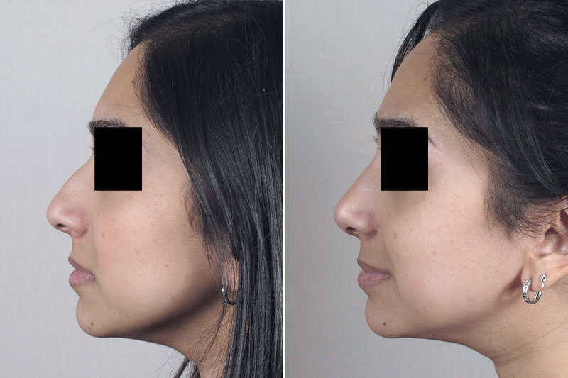 This 31 year old was referred to Dr. Parker by several other patients. She was bothered by the appearance of her nose, in particular the dorsal hump, bulbous tip, wide base and the nose pulling downward when she smiled. Dr. Parker performed an open rhinoplasty during which he removed the bony cartilaginous hump, performed infractures, refined the tip cartilage, removed the depressor septi muscles to prevent the nose from drooping and performed alar base resections to narrow the base of the nose. The patient recovered quickly and well. She was very happy with the improved appearance of her nose.