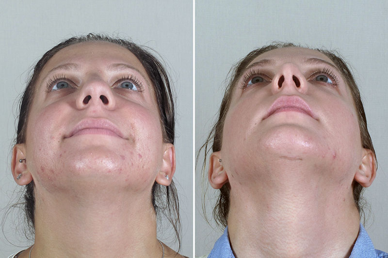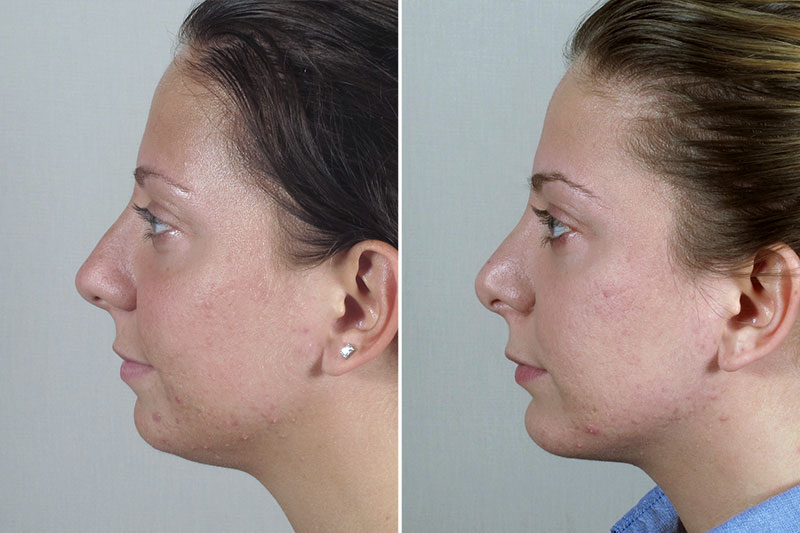 This 27 year old patient complained that her nose appeared too big for her face. She requested Dr. Parker make it smaller, less wide, and in better proportion with the rest of her face. She also said she had difficulty breathing through the left side of her nose. During the patient’s initial consultation with Dr. Parker, an open rhinoplasty was discussed to make the nose appear smaller. In addition, a chin implant was suggested to build out the chin as well as assist in making the nose look smaller and in better proportion with the rest of the face. At surgery, Dr. Parker performed an open rhinoplasty. He reduced the patient’s bony cartilaginous hump and performed infractures to reduce the size of the upper nose. Dr. Parker also reshaped the nasal tip cartilage to refine the tip of her nose, give it more definition, and make it look smaller. In addition, he performed alar base resections to narrow the width of the lower nose. Finally, a #2 extended anatomic chin implant was inserted to build out the chin. Following surgery, the patient recovered quickly. She can breathe well now and is pleased with the smaller appearance of her nose and improved facial proportions.