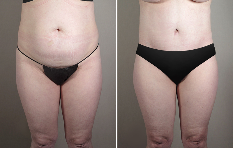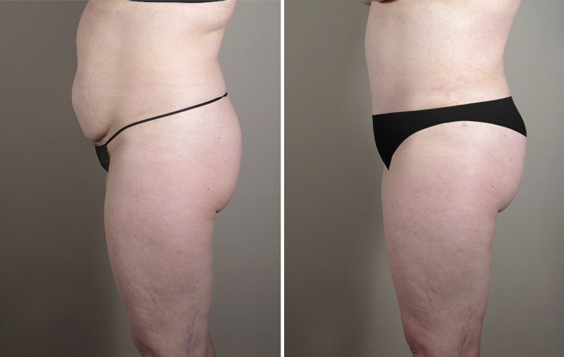 This 49 year old, referred to Dr. Parker by her dermatologist, consulted with him on two issues. She was to undergo removal of a recurrent and aggressive basal cell skin cancer on the base of her neck by a Moh’s surgeon. She was referred to Dr. Parker for reconstruction of the subsequent defect. In addition, she had lost 35 pounds of weight with diet and exercise. She was bothered by hanging skin and fat on her abdomen along with the fullness of her hips, inner thighs and knees. The patient is 5’6″ tall and weighs 163 pounds. Dr. Parker reconstructed the Moh’s defect at the base of the neck with adjacent tissues. At the same time, he performed a lipoabdominoplasty as well as VASER liposuction of the hips(removing 500 cc of fat from each side), inner thighs(removing 350 cc of fat from each side) and knees(removing 75 cc of fat from each side). The patient recovered rapidly after these procedures. She is absolutely thrilled with the excellently repaired scar at the base of her neck and the significantly improved contour of her abdomen, hips, inner thighs and knees.