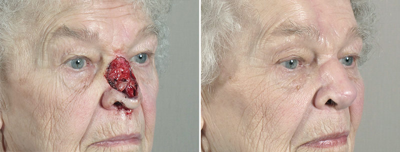This 85 year old was referred to Dr. Parker by a Mohs surgeon for reconstruction of a large, complex nasal defect following the removal of a recurrent basal cell cancer. The defect included a significant amount of nasal skin, cartilage and nasal lining. Dr. Parker reconstructed this defect using nasal lining flaps, septal cartilage which he carved to simulate tip cartilage and restore shape to the tip, and a forehead flap to recreate skin cover. The patient and her daughter were extremely appreciative of the reconstruction back toward a normal looking nose.
