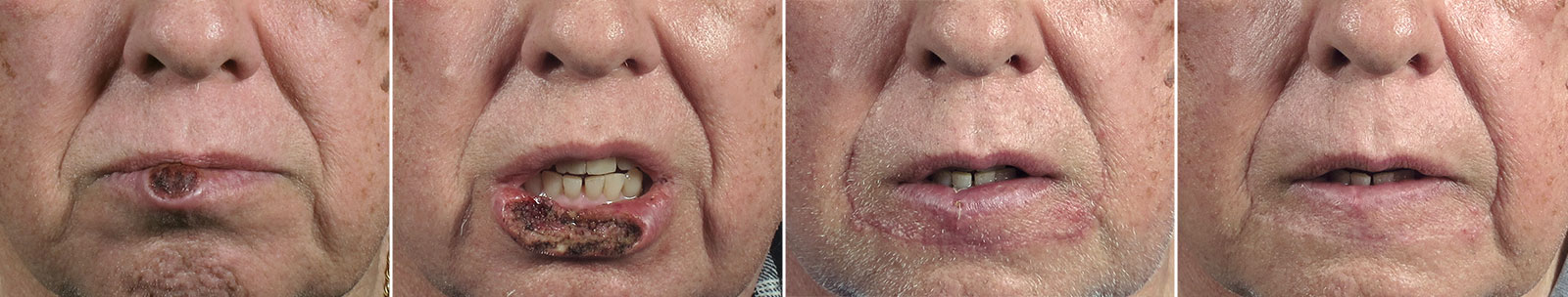This 78 year old was referred to Dr Parker by the Mohs surgeon who removed the squamous cell skin cancer from his lower lip. Dr Parker reconstructed the large defect with flaps of skin, subcutaneous tissue and muscle from the adjacent lip. The patient is very pleased with the results of his reconstruction.
