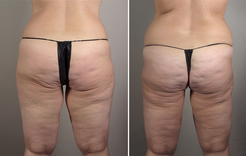 This 42 year old presented to Dr. Parker with concerns about the fullness and heaviness of her inner thighs. She said that this is a family trait. Over the past several months, the patient lost 35 pounds through diet and exercise. She is 5’5″ tall and weighs 160 pounds. After examining the patient, Dr. Parker explained that her inner thigh fat could be removed with liposuction. Her skin tone was moderate to poor though and he suggested her skin be tightened at the same time with an inner thigh lift. The patient requested the final scar be designed so it would be hidden in her groin crease. Subsequently, Dr. Parker performed this procedure. He removed 375 cc of fat from both inner thighs with the VASER liposuction cannulas, then removed a 3″ wide segment of skin to lift and tighten the inner thighs, leaving the final scar hidden in the groin crease. The patient experienced a rapid recovery from surgery with very little pain. She is very happy with her results. She noted at her last visit that her dress size has decreased from 12 to 8.