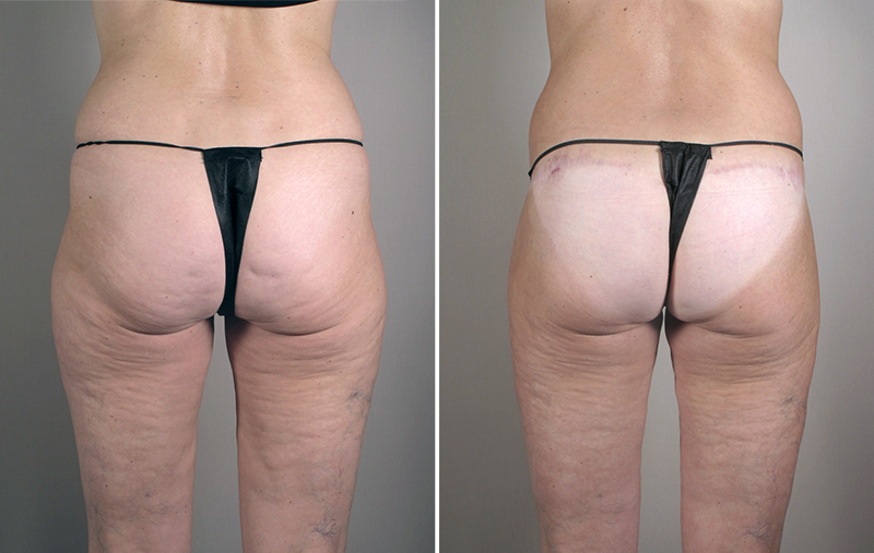 This 48 year old was referred to Dr. Parker by her dermatologist to improve upon the laxity of her thighs and buttocks. She had gained 70 pounds with her last pregnancy and this had stretched out her skin significantly. She is 6′ tall and weighs 150 pounds. Dr. Parker performed a vertical inner thigh lift and a lateral thigh/buttock lift at the same time. The patient recovered quickly after her surgery. She is delighted with the markedly improved contour of her inner and outer thighs as well as her buttocks.