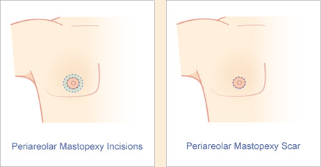 Patients with a moderate amount of skin excess have their excess skin removed using a circular periareolar incision. This leaves a scar around the areola only, which typically heals well because of the color differential between the darker areola and the lighter surrounding skin.