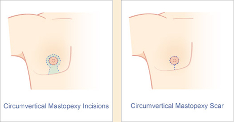 In patients with larger skin excess, it may be necessary to add a vertical component to the periareolar skin incision, using what is termed a circumvertical skin incision. The leaves a “lollipop” type scar on the breast. Normally, this scar fades over time to the color of the surrounding skin.