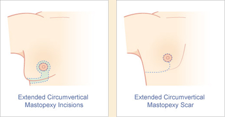 Patients with even more skin need the incision extended outwardly along the inframammary crease. This allows removal of a substantial amount of skin and leaves a somewhat “extended lollipop” type scar on the breast: this is called an extended circumvertical skin incision.